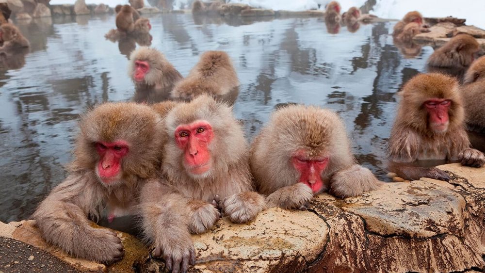 - Бұл маймылдар суық мезгілде жылыну үшін термалды бұлақтарды игерді. Топтар ыстық моншаларға үнемі барады, онда күн сайын бірнеше сағат өткізеді. Мұндай мінез-құлық Дзигокудани аймағында және басқа да кейбір жерлерде байқалады.